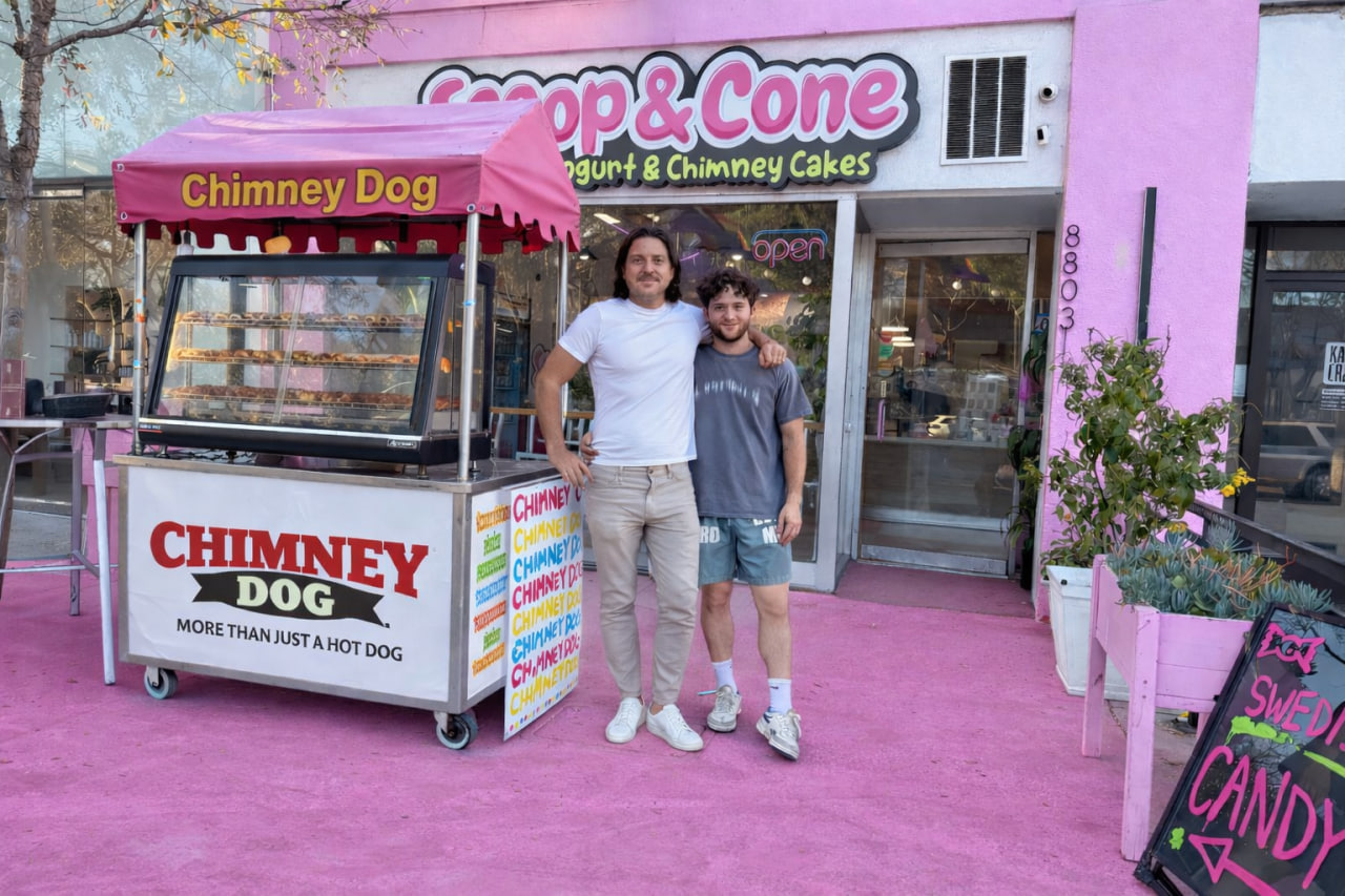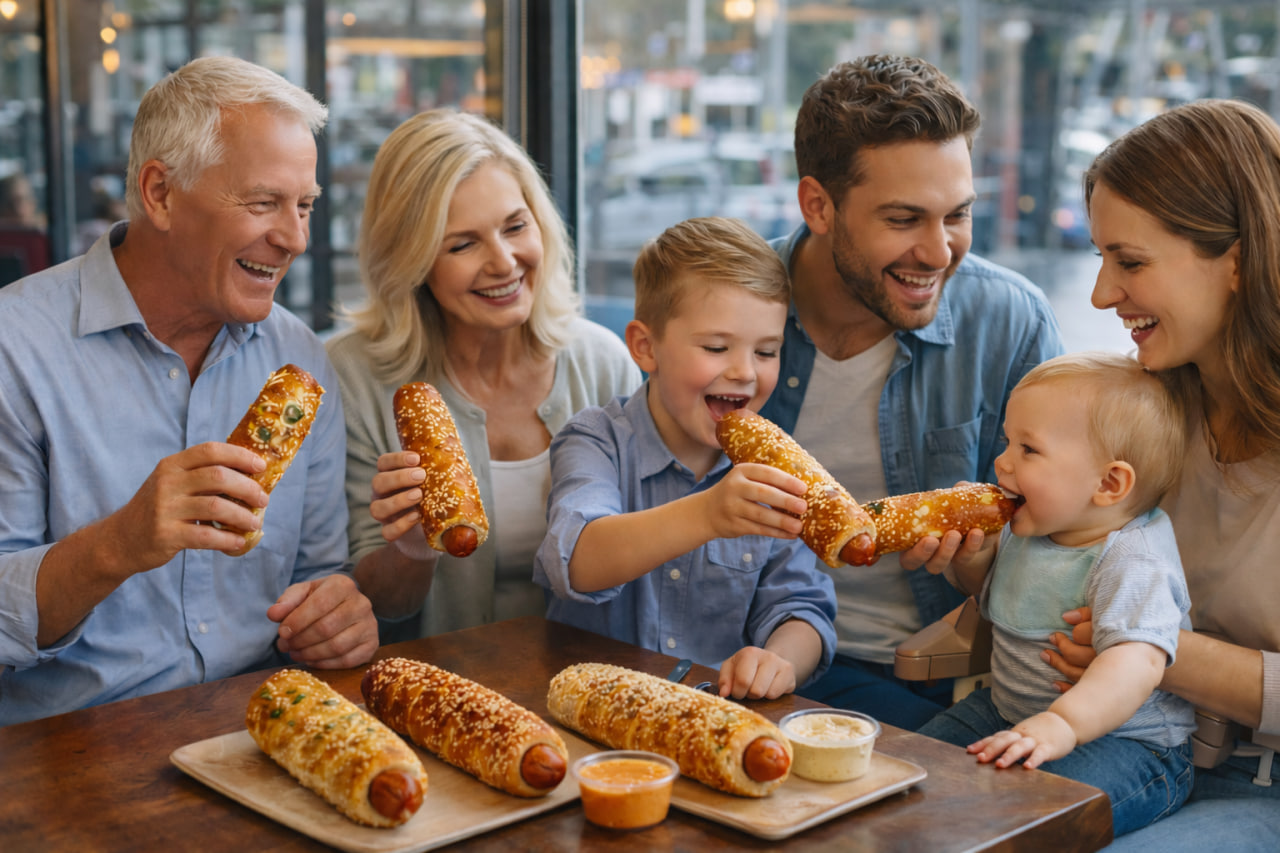 A handcrafted, all beef hot dog wrapped in authentic Hungarian chimney cake dough slow-baked, never fried, and finished with bold, crave worthy toppings.